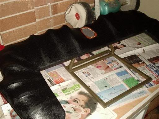 today the f/g work started finally on the upper tier. The skeleton pieces were hot glued in place and then fabric stretched over...couple coats of resin were applied to stiffed it all up to get ready for the f/g matt (this week some time).