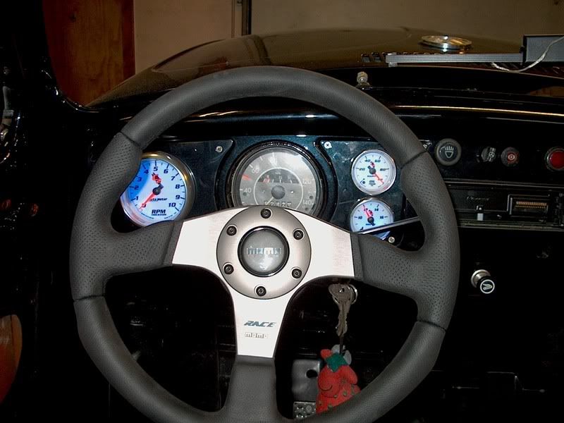 I am also surprised how good the Autometer C2 gauges look with the stock speedometer. I'm curious as to how they look at night. Also, what size Momo steering wheel is that? Does it block the view of the tach? That's some serious custom work. Well done. |
