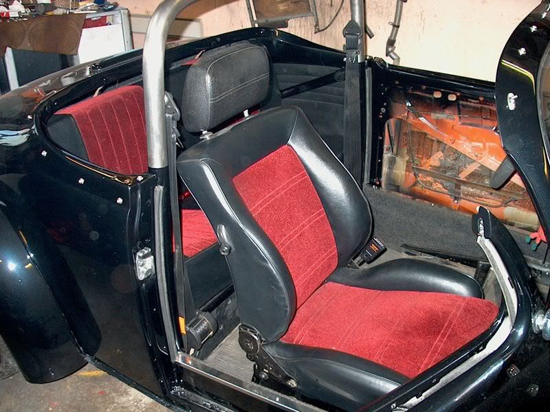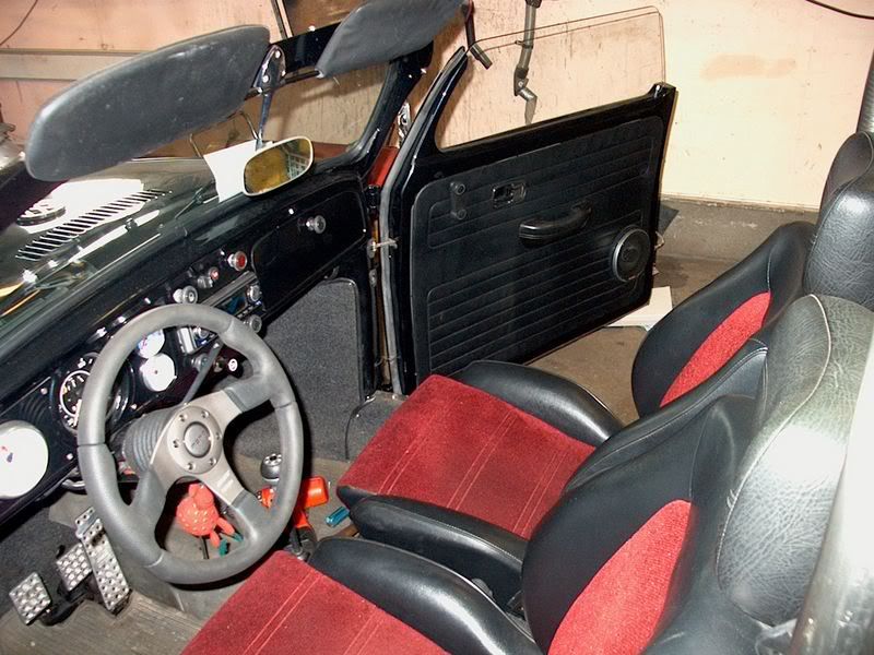 The rear seat is stock and the front seats are from a MK1 Golf GTi / Rabbit. They have been retrimmed with fabric frm TMI.