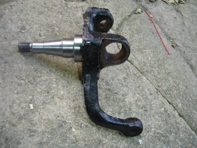 I spent some time at the weekend measuring my disc stubs to see if i can use them .I have figures out that i need to drill the two M10s for the bracket 8mm in front of the back plate mounting holes which have the same pitch of 56mm .What i did find strange is that the mounting point measured from the rear bearing shoulder to the caliper mount is the same .This means that i need to gain the 10mm for the bracket.I can gain the 3mm from deepening the hub and the rest from machining the stub axle as you did the drum one .This leaves 10mm of tapped hole for the bracket and makes the caliper sit as the original spec.Of course i then have to cut the original vw mount back.Incidently i have build up up my stubs with weld and machined to use the porka bearing .I may regret this as it seems to use an imperial race 3/4 and 1"1/4. |