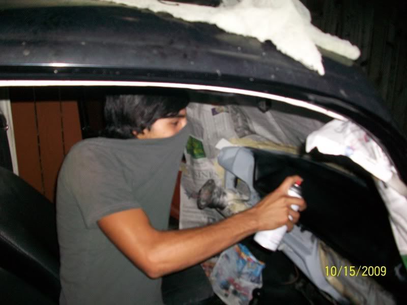 after applying the fiberglass http://i24.photobucket.com/albums/c4...5.jpg~original I let the fiberglass cure for a day before sanding it smooth. http://i24.photobucket.com/albums/c4...6.jpg~original Once it was silky smooth I applied two coats of primer. I wasn't able to find the picture of it primered. But here I am applying the first coat of satin black. http://i24.photobucket.com/albums/c4...9.jpg~original |