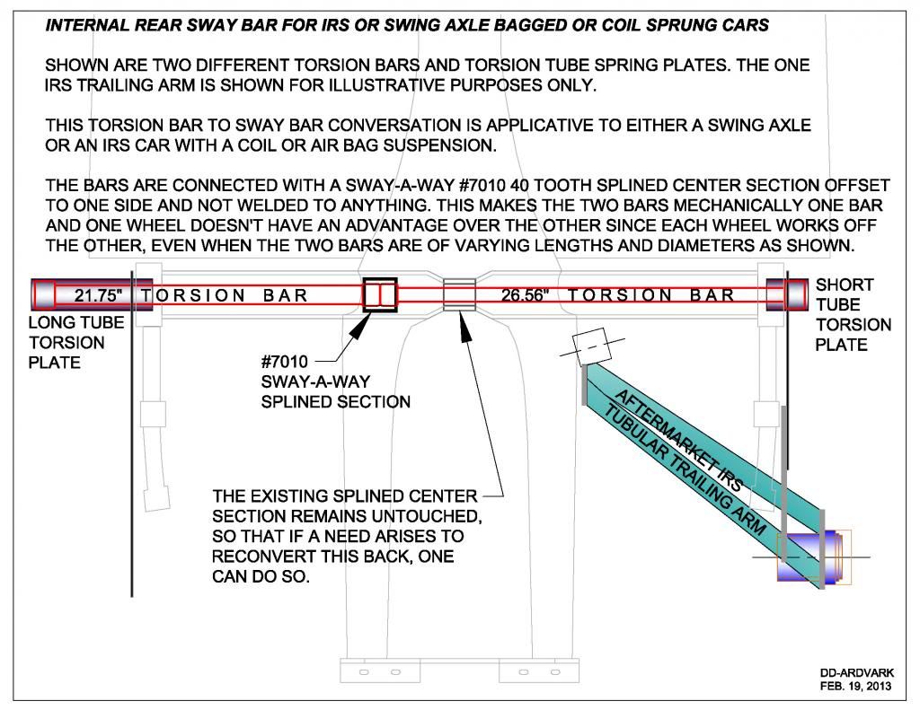 - So for those familiar with Formula VEE racing and the way the ball joint and link pin front ends are set up on these cars, that the lower spring pack is replaced with a solid rod that connects the two front lower trailing arms together to act as a sway bar. - Now envision the rear torsion housing of a beetle and a bar connecting one side to the other, hidden inside the housing to act as a sway bar. Again, this only works if you’re going to coil over shocks or air bagged suspension. Assembly explanation: - Put a Short Tube torsion plate, w/a 26-9/16” long torsion bar on one side of the car. Push this bar through the existing torsion housings splined center section. It will stick out a few inches offset of center into the other side of the housing. Use a 21-3/4” long torsion bar and Long Tube torsion plate on the other side. The connection of these two bars will be a “Sway-A-Way” #7010, 40 tooth Splined Center Section that’s NOT welded to the torsion housing. Most people don’t need an explanation, but some do. So, a swing axle Ghia turns into a corner at speed. Instead of getting body roll and wheel tuck, it gets lower to the ground and stays flat. As the outside rear wheel is pushed up in to the fenderwell, the inside rear wheel is also picked up and this forces the front inside of the body with tire down. In the racing world simplifying to attain the same end result and losing 4 to 5lbs. of inertia rebound weight of an external sway bar along with being able to switch bar dia. sizes and mix and match to suit your ride is king. This also makes your sway bars twist and trailing arms pivot point the same, alleviating additional suspension resistance. To those who sell external sway bars in cute shapes and pretty colors attached to spring plates with adjustable heim ends that eliminate the torsion bars altogether. Don’t blame me for not buying your expensive products, the economy caused me to use my out of the box thinking instead of my wallet and come up with a better mouse trap and share it with the public. :lmao: But don’t worry…, stupid people will still buy shinny complicated things with multiple parts, thinking they’ll go faster because it relates - cost to speed. David / dd-ardvark |