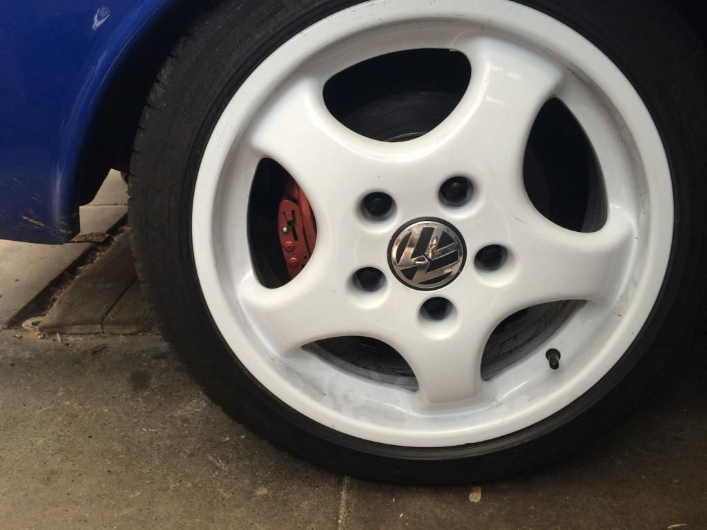 Had I of removed the wheel from the car the plastic bags wouldn't of been necessary, but as I was being lazy I used the plastic too prevent the porsche caps from falling beyond the shoulder of the cap edge. I've not pictured it but the porsche caps have been hugely trimmed to allow the vw cap to sit further back into the wheel. Before trimming the cap the vw badge sat about 3-4mm proud of the wheel face. The solution was to trim the edge of porsche badge allowing the vw badge to sit further in. Lesson to be learnt is that people shouldn't be lazy and remove their wheels |
