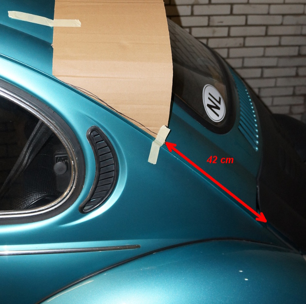 He wanted to participate in a Land Speed Record event, and a Holzapfel spoiler is probably very good for aerodynamics at high speed. The "Holzapfel-spoiler" is this rear spoiler: ![]() (picture is from: veloce-gt.com ) This will be a small report on how I build it, maybe you can use it to build your own. This is a bit like open-source code. ![]() I took some measurements from pictures (mainly the one above), and scaled them to the right size. That gave me the rough measurements. I used it to cut out a piece of cardboard and test fit the spoiler to my car. I had to trim the carboard several times to make it fit right. But this was the result: And these are the final measurements: ![]() So, if you want to create your own, cut out a piece of cardboard with those measurements and test fit it to your car. IMPORTANT: The distance between the end of the spoiler to the end of the raingutter is 42 cm. Like this: ![]() Then I orderd a huge sheet of plastic, it's 2000 by 1200 cm and 0.3 cm thick made of polystyreen. I used the piece of cardboard as a template and marked where I had to cut it. Because the plastic sheet is quite thin, it is difficult to cut. So I pre-drilled the mounting holes in the spoiler. These holes will be where the spoiler is screwed to the roof. But now I use them to attach the sheet to a piece of chipboard wood I had lying around. ![]() (crappy cellphone picture..) You can see the 7 screws I used to screw the sheet to the chipboard. After that I sawed the sheet together with the chipboard with a jig saw. A tip: if the plastic compagny can deliver the sheet pre-cut, order it in pieces of 22,5 cm. It will save you a lot of time. (another crappy cellphone picture..) Then I copied the shape of the left en rear corner of the spoiler, using the cardboard (the template) version of the spoiler mounted with tape on the car. I copied the roof (front) side and the rear (above rear window) side. I used another piece of cardboard on which I traced the shape with a marker on the rear. On the front I cut a piece of cardboard to match the shape of the roof. With that I made two molds that represented the shape of the spoiler ends. ![]() Because the plastic sheet is 0.3 cm, I made them 0.3 cm "smaller". Then I clamped one end of the cut out plastic to one of the molds and used a hot air gun to soften the plastic. This takes some patience, the plastic gets soft at around 100 degrees Celcius, so slowly move the hot air gun over the plastic staring at the top. Move it over the width of the spoiler until it falls into the shape and then proceed downwards until the plastic has the shape of the mold. Another, maybe better I don't know, is to use a cheap electric barbeque. Place the end of the plastic cut-out above the barbeque, and heat it until the backside is around 100 degrees or until it "feels" flexible enough. Then place it on the mold. Checking the temperature is best done with an infra red thermometer. The plastic can be re-heated several times, so problem areas can be corrected by re-heating. Now the spoiler can be mounted with screws through the roof in the front. But you will also have to fabricate some kind of brackets to hold the spoiler to the car at the rear, near the raingutters left and right. This is the finished spoiler mounted to Wally's car: ![]()