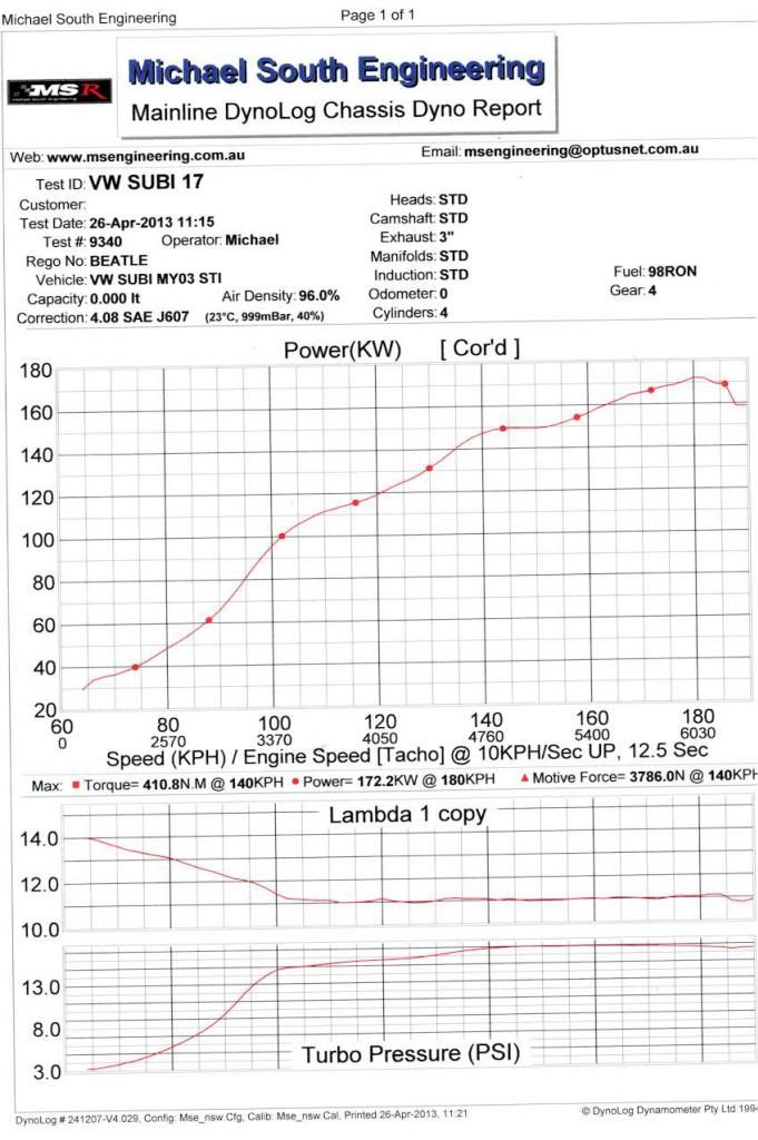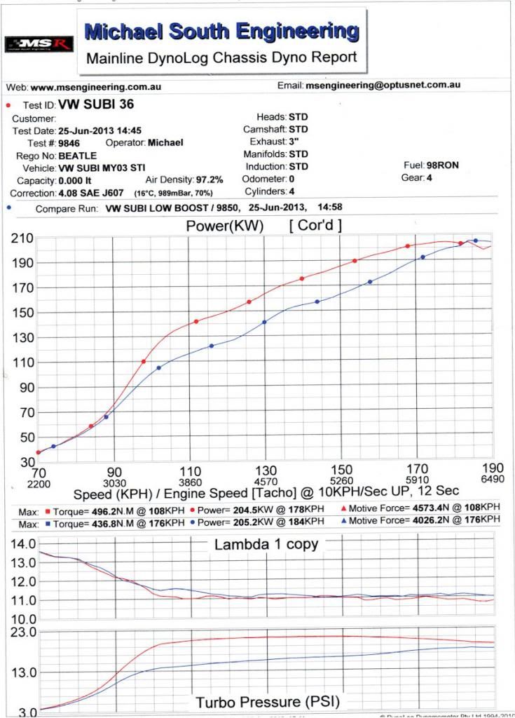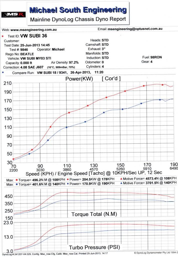 Just got back from the dyno shop, good news is that kilowatts were found as well lots of torque. Shame its raining, I had to behave myself. MSEdyno 2 is high and low boost settings on the e Boost 2, blue is low, red is high. MSEDyno 1 is just two different runs. The E boost 2 defaults to lower setting which is about 16 psi on start up, I need to select the higher setting if I want it. Its a heavy car so I will see how it goes on the weekend at the VWMA drags in Sydney. Steve http://i1184.photobucket.com/albums/...c.jpg~original http://i1184.photobucket.com/albums/...8.jpg~original |