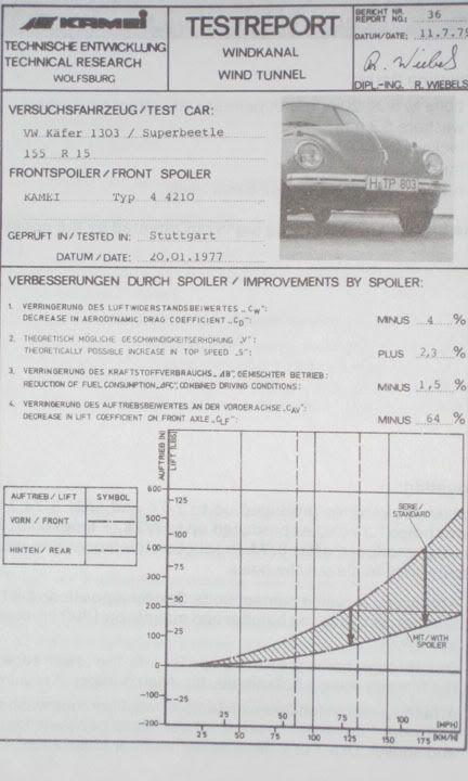 The bugīs aerodynamics are greatly improved by lowering the vehicle and adding spoilers as everyone knows.However,I havenīt seen any values to compare. Some of the Käfer Cup bugs and a few of the hillclimb bugs have slots or holes in their fenders and some run shorter rear fenders allowing more air to pass out the back.If your racing,looks arenīt as important as function so I doubt that anyone is really going to adapt that to their street car. |