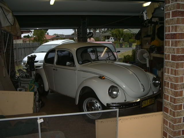 nothing happening as yet, have a funeral tomorrow on my day off so doubt much will get done, instead of trying to squish my stuff in im doing abit of maintenance on my missus's car... shes got good taste aswell... what do you think? oh and does anyone know what causes free play on a ball joint bug with a new steering box? adjusting screw doesnt change anything... i have no idea aboutr these beam things, give me struts anyday i say, so would you call this a GL bug? 17x7s white with pink/purple pearl through it, lowered, is it enough to be a GL???