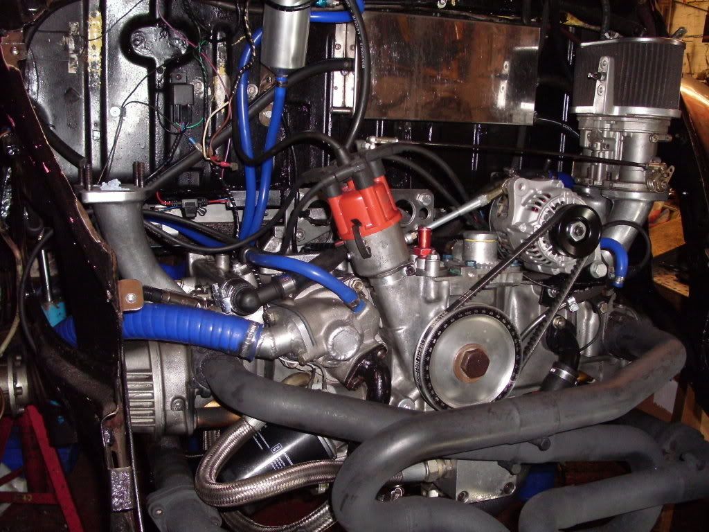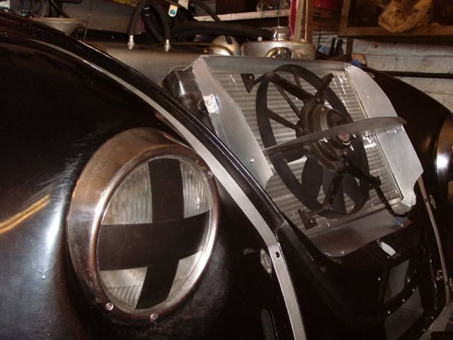 Badbug, you can just see the l/h rad in the pic, the r/h one is in a similar position near the starter. Here's the front rad', its set high to self bleed easily, and allow some protection in the event of..... oops, it happens...plus other stuff is mounted under it, battery, oil coolers etc, the rake angle and ducting slow the air making it more efficient, it has a built in expansion tank and can be moved warward for service purposes without dismounting coolant pipes, exit air is ducted out in the low preasure area behind the front wings. regards....http://i254.photobucket.com/albums/h...5.jpg~original