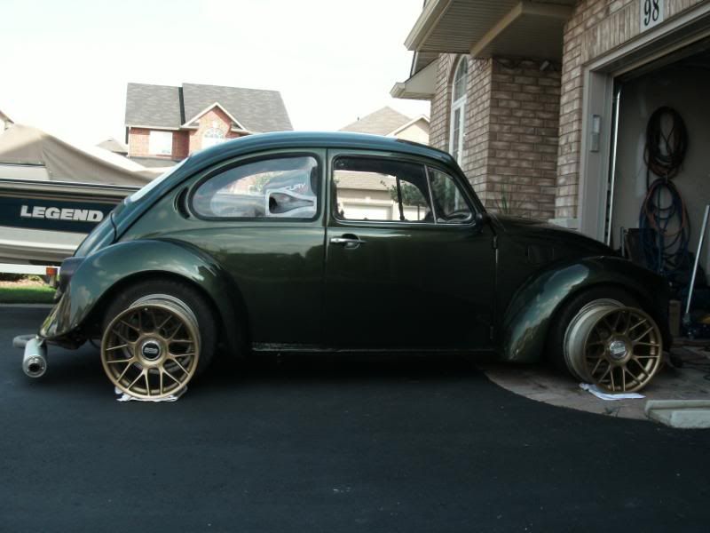 Humble, thanks for the Info I have No leaks at the block and the pump Sealed up nice and good I guess, I'm going to put a switch on the tank valve so it wont let me turn the car over B4 opening it So I don't kill the motor... As for the pulley it's only 5 1/4" and I changed the Alt pulley to a Smaller 356 pulley and oil temps are GREAT :) and For Wheels I have a set of 17X8 BBS RC painted gold. Jason... did the Windows myself it's just Lexan took the old window and copied it Fits great :) and the Muffler you guys are going to love this but ti was something Different, but it's from a GSXR 750 and ya with the 3" wider fenders it looks just fine... and I brang it up tighter to teh fender after it's all Done Pete got the Wheel off Ebay. think it was about $260ish US well worth it :D also Have an update... have abit of an oil Leak at the Coolers and From the AN fittings :S soo have some new ones and I'll try them, and the oil pressure gauge went for a Crap same with the 5 year old Tach... So hoping for some nice weather to fix them tomorrow then Off to paint tue or wed... I'll post pics when it's all done thanks again Chris |