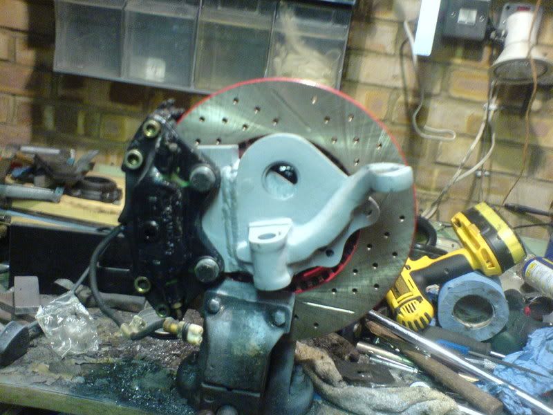 This conversion requires some specialist machining, but provided you can explain what you want done to a good machining shop, it's not that difficult to achieve. The calipers also require a little welding to re-shape the mounting points. Other than that, the conversion is simple to do. I say simple because you have to pay someone else to do all the hard work. To get the hub to fit the CB spindle is easy enough. All that is required is that the inner and outer bearing surfaces be enlarged by using some custom machined bushings, then the spindle will accept standard Porsche bearings and be able to be held in place with all standard VW hardware. The bushings must be machined with very close tolerances so they have to be heated to be put onto the spindle, then when cooled they will never move. At a first glance the caliper appears to not be able to fit the spindle because the stock upper mounting point on the Brembo caliper interferes with the steering arm on the spindle. The solution is to cut the upper caliper mount off the caliper and then after measuring up and setting the caliper position, have a new mounting point welded into place. To get the pistons to operate symmetrically and also to form a new mounting point on the caliper it was necessary to cut a spacer out of 6mm plate aluminium that is shaped to fit the factory caliper mounting point on the CB Performance spindle. It was also necessary to shave about 3mm from the top spindle mounting point on the CB Performance spindle so it didn't interfere with the pads in the caliper. So with all this done, and the spacers bolted onto the calipers, the calipers were dropped off to an aluminium welding shop to have the mounting points re-formed to the shape of the spacers. The results were excellent, and only required a little bit of shaping with a file to get a perfect fit. This is the Porsche 944 Turbo 304 mm disc rotor mounted on the Porsche 944 hub. I have also had a pair of 16 mm spacers machined up to allow my Porsche Fuchs to not interfere with the caliper. http://www.germanlook.net/forums/pic...&pictureid=894 Here you can see the upper calliper mount has been shaved of about 3mm material so it doesn't interfere with the brake pads in the Brembo caliper. http://www.germanlook.net/forums/pic...&pictureid=893 A rear view of the spindle, again you can see the trimmed down spindle mount. http://www.germanlook.net/forums/pic...&pictureid=892 This is the spindle with the inner and outer bearing surfaced enlarged with a couple of custom machined bushings. The bushings must be heated to allow them to expand and fit the spindle. http://www.germanlook.net/forums/pic...&pictureid=891 Here is the hub and disc rotor mounted on the spindle. http://www.germanlook.net/forums/pic...&pictureid=890 With the bearing races fully tapped into the bearing faces of the hubs, the disc rotor had about 2mm clearence to the spindle. The less offset change the better. http://www.germanlook.net/forums/pic...&pictureid=889 Excuse my rough picture, but this is supposed to be a picture of the 6mm aluminium caliper spacer that goes between the spindle and the caliper. After getting the fitment correct, I bolted the spacer to the caliper in the correct position so it would be welded into the correct place by the machine shop. I also grinded a deep groove along the joining surfaces where the caliper and the spacer meet. http://www.germanlook.net/forums/pic...&pictureid=888 The black line represents where I had cut a straight line from the top of the calliper to near the bottom caliper mount. This allowed me to then fabricate a 6mm spacer, and then have an aluminium welder build up new mounting points. http://www.germanlook.net/forums/pic...&pictureid=887 The inside view of the completed caliper modification. You can see the spacer shape a little better from this angle. Tip: When you take them to the welder to have them weld up the new mounting point, warn them about the possibility of brake fluid boiling out of the caliper when it gets hot. http://www.germanlook.net/forums/pic...&pictureid=886 You've all seen Porsche calipers before, but this is a picture of mine after I've re-sprayed them. I had removed the pad locking clip and the brass, and blocked them off with 1/8" BSP plastic plugs. http://www.germanlook.net/forums/pic...&pictureid=885 To finish the calipers off and to make them look as factory and un-modified as possible I decided to spend a little time making them look good. After etch priming and surface priming, I wet sanded the calipers with 600 grit paper, then painted them with red Porsche touch-up paint (2 coats). I then carefully exposed the aluminium Porsche and Brembo lettering by filing the red paint off with a flat file. Finally I finished the calipers off with three coats of clear top coat. http://www.germanlook.net/forums/pic...&pictureid=884 Last of all, here is the new brake setup fitted to my '66 bug King and Link suspension. Overall I'd guess the wheel track modification from stock is about 22mm, and an additional 16mm wheel spacers with my wheel spacers. http://www.germanlook.net/forums/pic...&pictureid=883 Completed. The Porsche 15"x6" wheels fit nicely under the stock guards, thanks to a 3" narrowed front beam that I made by using a kit I obtained from www.airspeedparts.com. http://www.germanlook.net/forums/pic...&pictureid=882 After fitting the brakes, I went for a drive to bed in the pads. I've read that the best approach is to accelerate to 100Km/h, then brake lightly at first to 20km/h, and repeat 6-10 times braking more heavily each time until you finally braking very hard for the last time. When finished you should be able to smell the brakes cooking. With the brakes bedded in, they operate very smoothly. I'd estimate they perform about twice as well as the factory VW brakes. The car actually stops like a "NORMAL" car now. It is such an improvement that I honestly think it is comparable to something late model with power assisted disc br