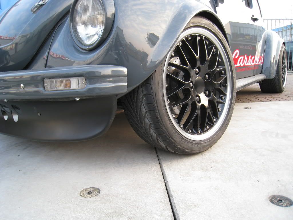 The grey car is from Franc (ww.carsche.nl) and is a '74 model. We know each other some 20 years I guess... He has taken lightness very far as it has carbon bumpers and self made aluminium bumper brackets. The Wiechers cage is also aluminium. Engine is a 2056cc type 4 and has some of my old parts in there (JE pistons, Webcam 86, type 1 followers). BAS exhaust and at the moment 40 IDF's. He plans to upgrade to EFI with a DTA E48 ecu soon ;) Tires are Toyo race-intermediate slicks IIRC. Very cool! Wheels are BBS 16" , so not that big really ;-) |